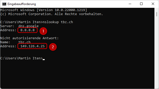 Frage: Im nachfolgenden Screenshot sehen Sie einen regulären nslookup für die Domain tbz.ch. Beschreiben Sie was Sie bei 1. und 2. für eine Information zurückerhalten.