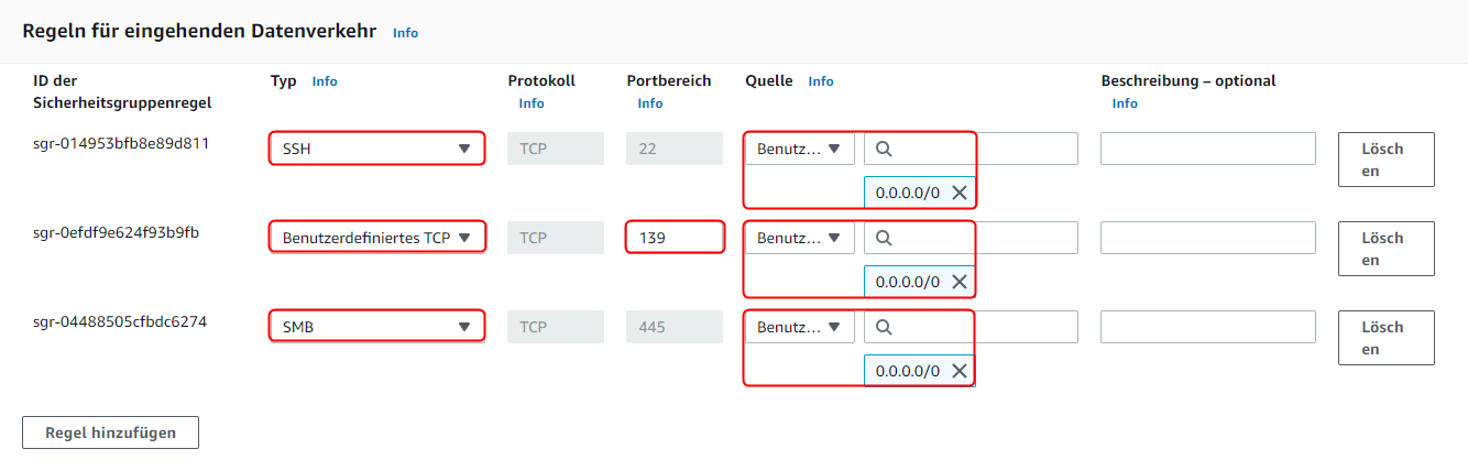 SSH -Quelle0.0.0.0/0 BenutzerdefiniertesTCP TCP139 - Port 139 - Quelle0.0.0.0/0 SMB -Quelle0.0.0.0/0